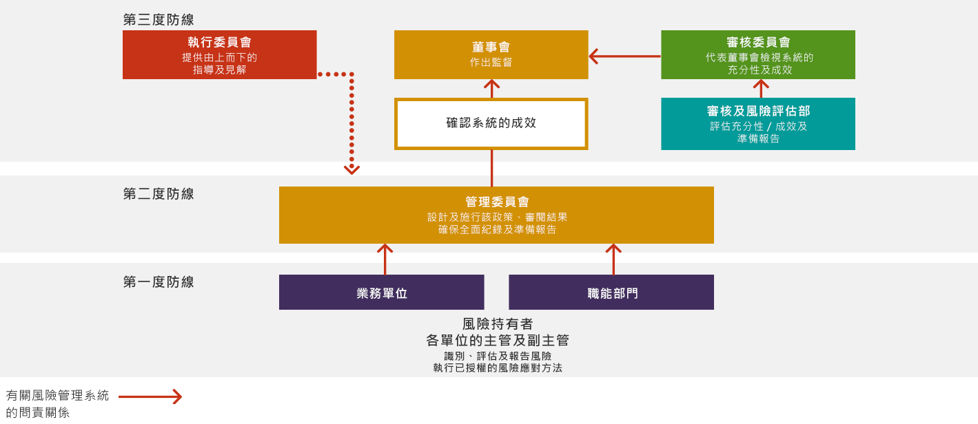 集團制定了一套風險管理政策,定期引導風險識別、風險評估及風險管理等流程。行政總裁,即風險總監,帶領所有業務及職能單位有效執行風險管理政策。